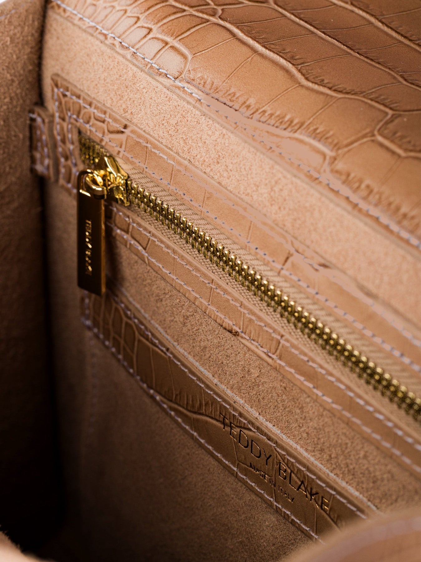 The New Ava by Teddy Blake signs a modern twist to an iconic chic design. Crafted by expert artisans in Italy with croco embossed calf skin. The style features a single round handle with a flap closure that opens to reveal a soft suede interior and well though compartmentalization with side pockets included. The Ava bag can take you from a ladies luncheon to an evening out without missing a beat when it comes to style and elegance.