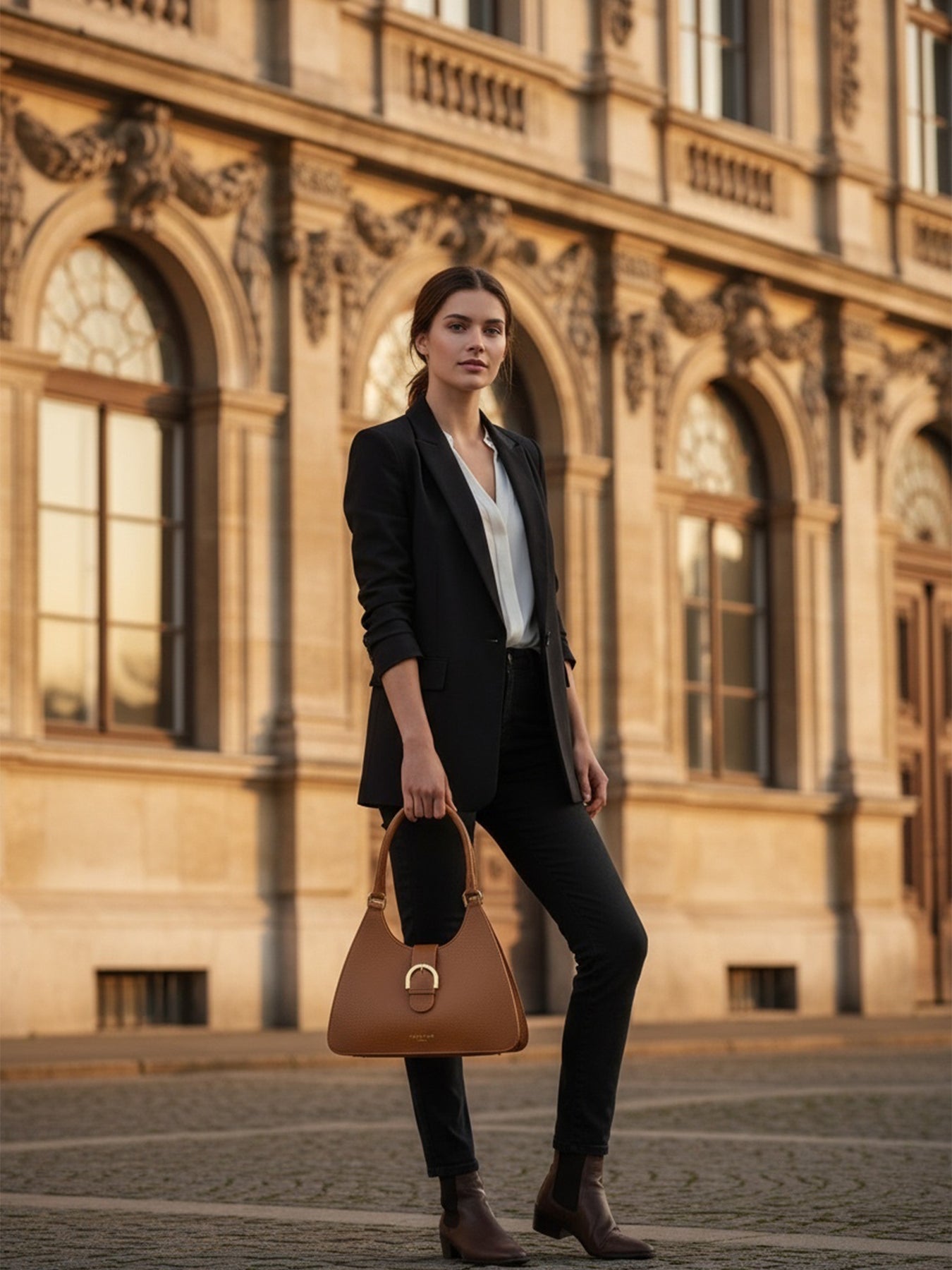 A refined handbag with a sleek, structured shape and polished details. The curved top handle offers a comfortable grip, while the gold-tone buckle adds a sophisticated accent. A detachable shoulder strap ensures versatility for any occasion. Designed for effortless elegance and functionality.