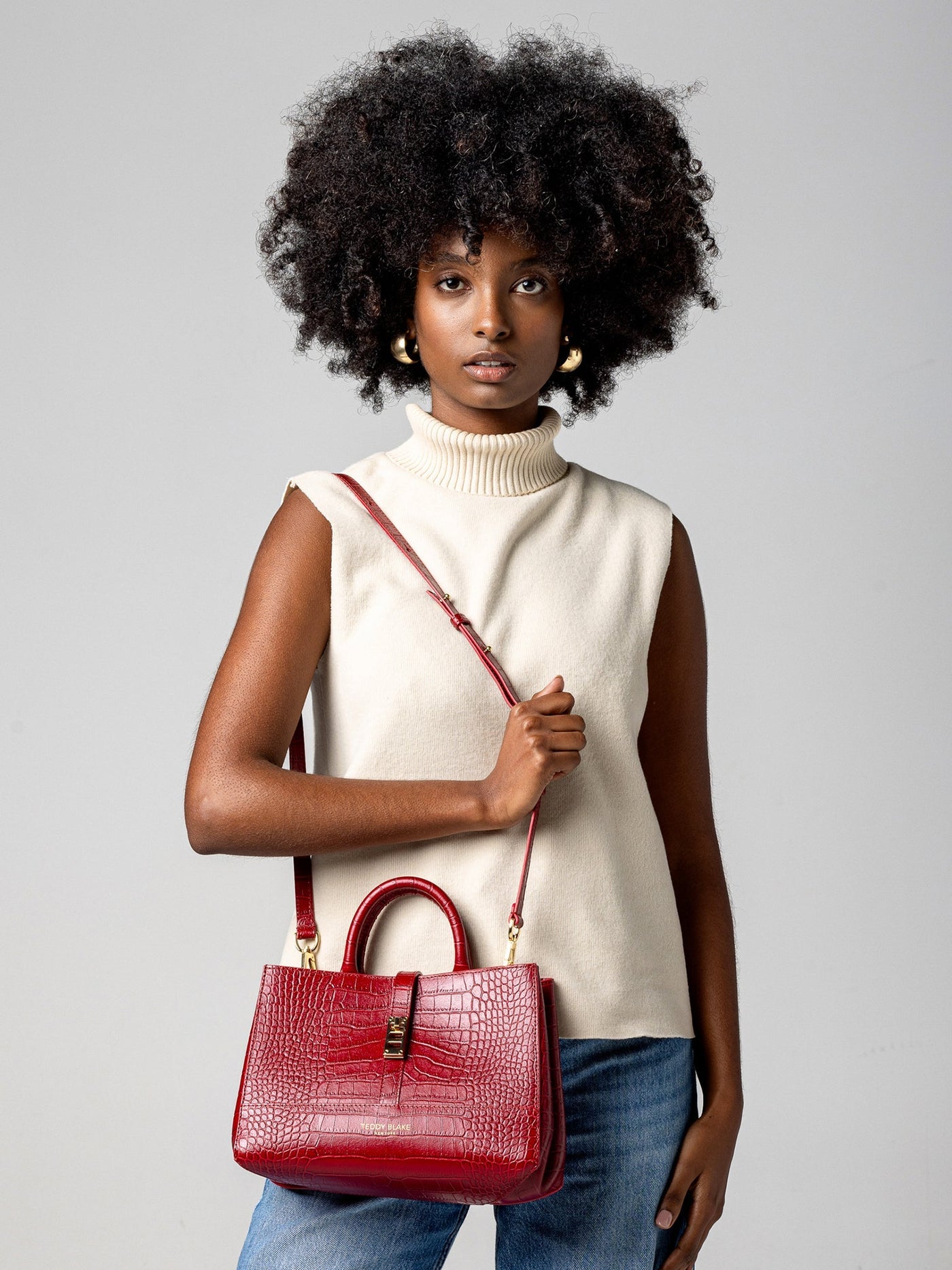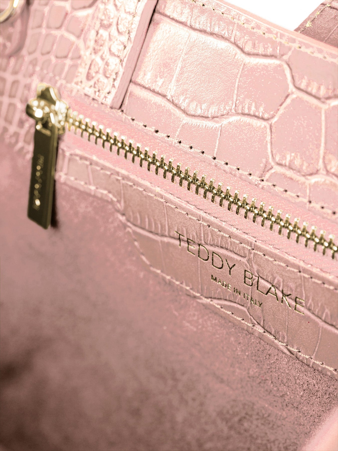 Fashion & function describes the Lola bag, the latest addition to Teddy Blake's line. Crafted in Italy from croco embossed calf skin , the boxy silhouette offers versatility with double top handle, shoulder strap, and a spacious, suede-lined interior. Adorned with gold detailing the center strap closure ads a dash or retro chic to its modern appeal. Style the Lola your way, every day from the office into the city.