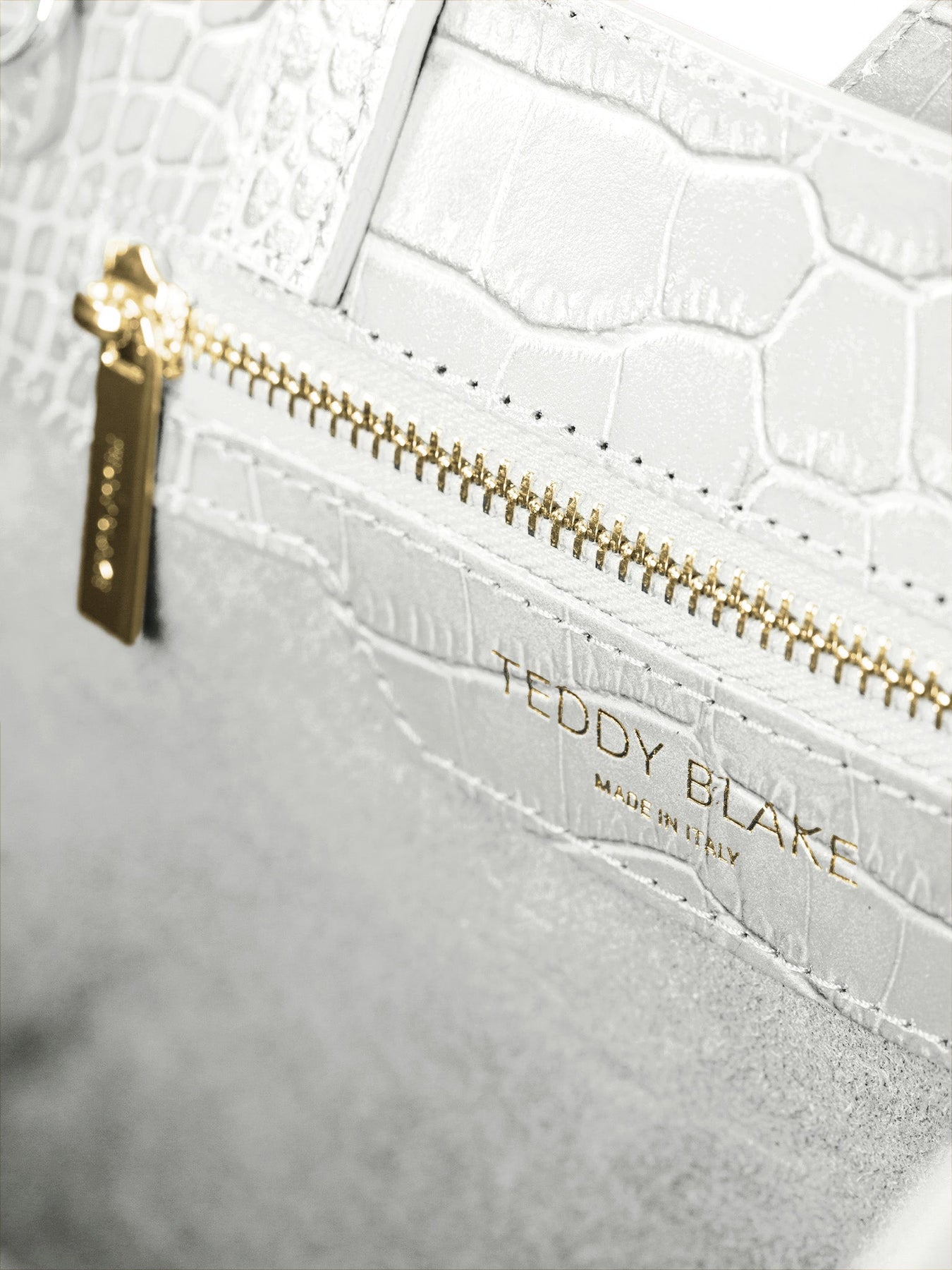 Fashion & function describes the Lola bag, the latest addition to Teddy Blake's line. Crafted in Italy from croco embossed calf skin , the boxy silhouette offers versatility with double top handle, shoulder strap, and a spacious, suede-lined interior. Adorned with gold detailing the center strap closure ads a dash or retro chic to its modern appeal. Style the Lola your way, every day from the office into the city.