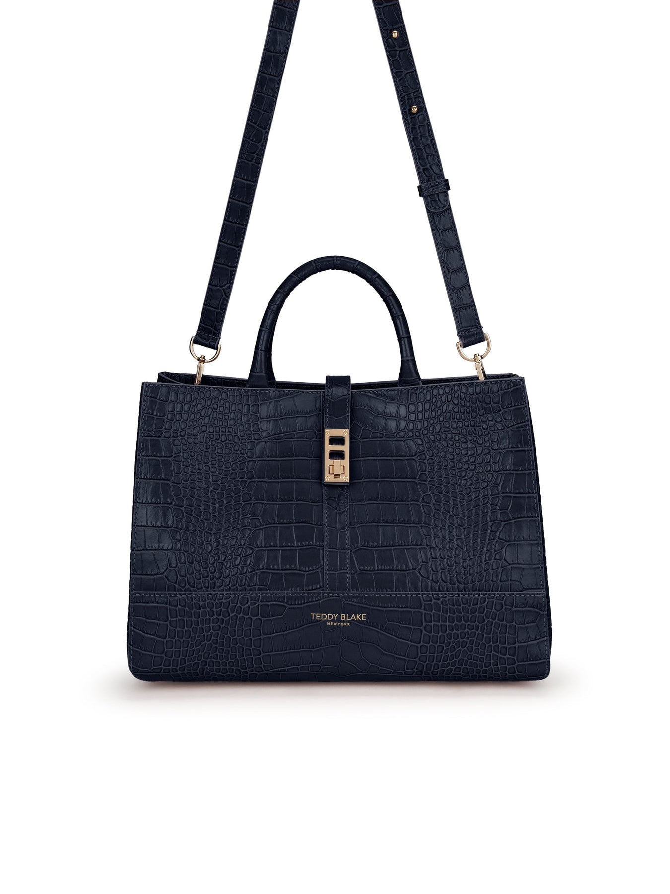 Fashion & function describes the Lola bag, the latest addition to Teddy Blake's line. Crafted in Italy from croco embossed calf skin, the boxy silhouette offers versatility with double top handle, shoulder strap, and a spacious, suede-lined interior. Adorned with gold detailing the center strap closure ads a dash or retro chic to its modern appeal. Style the Lola your way, every day from the office into the city.