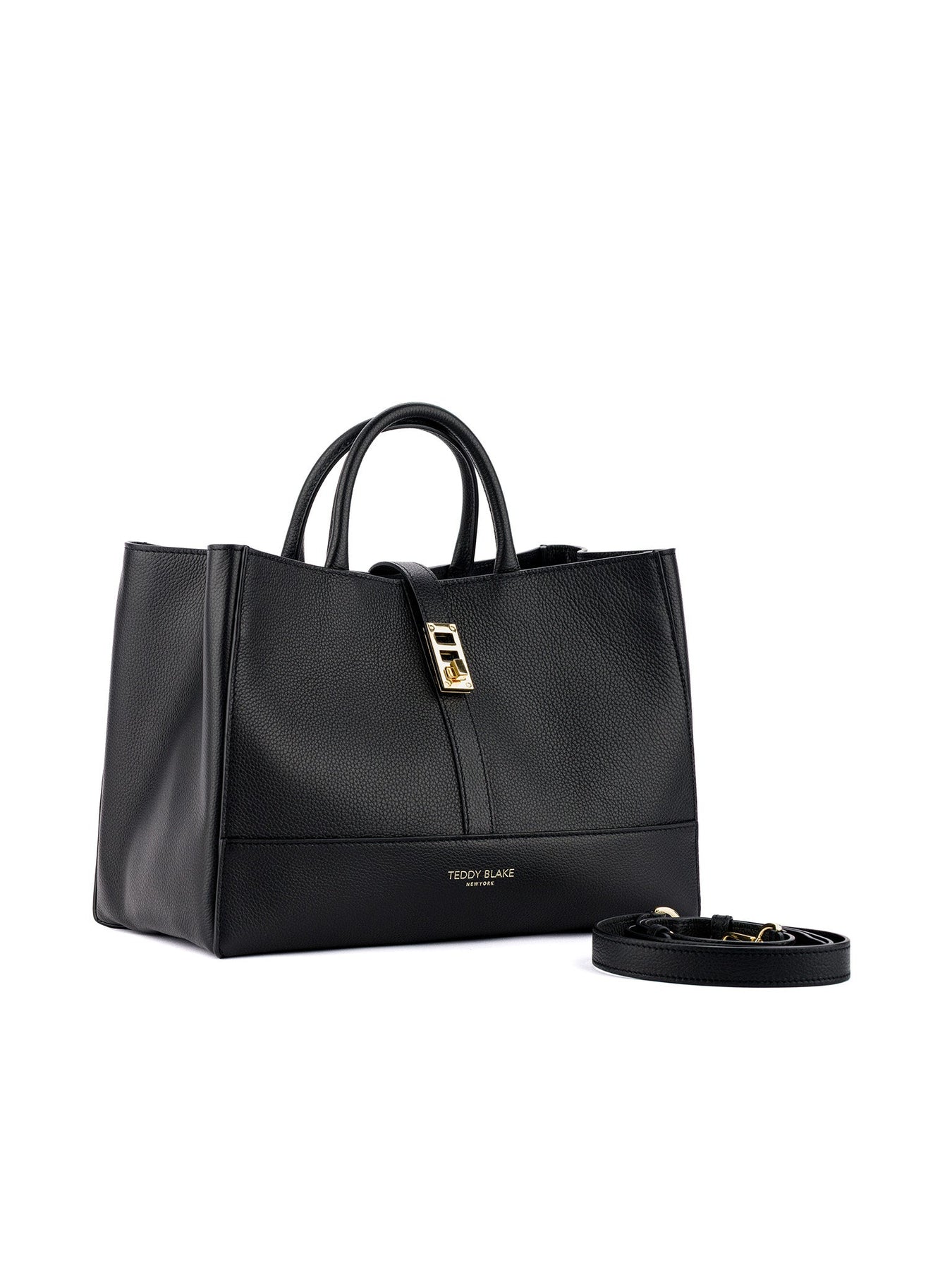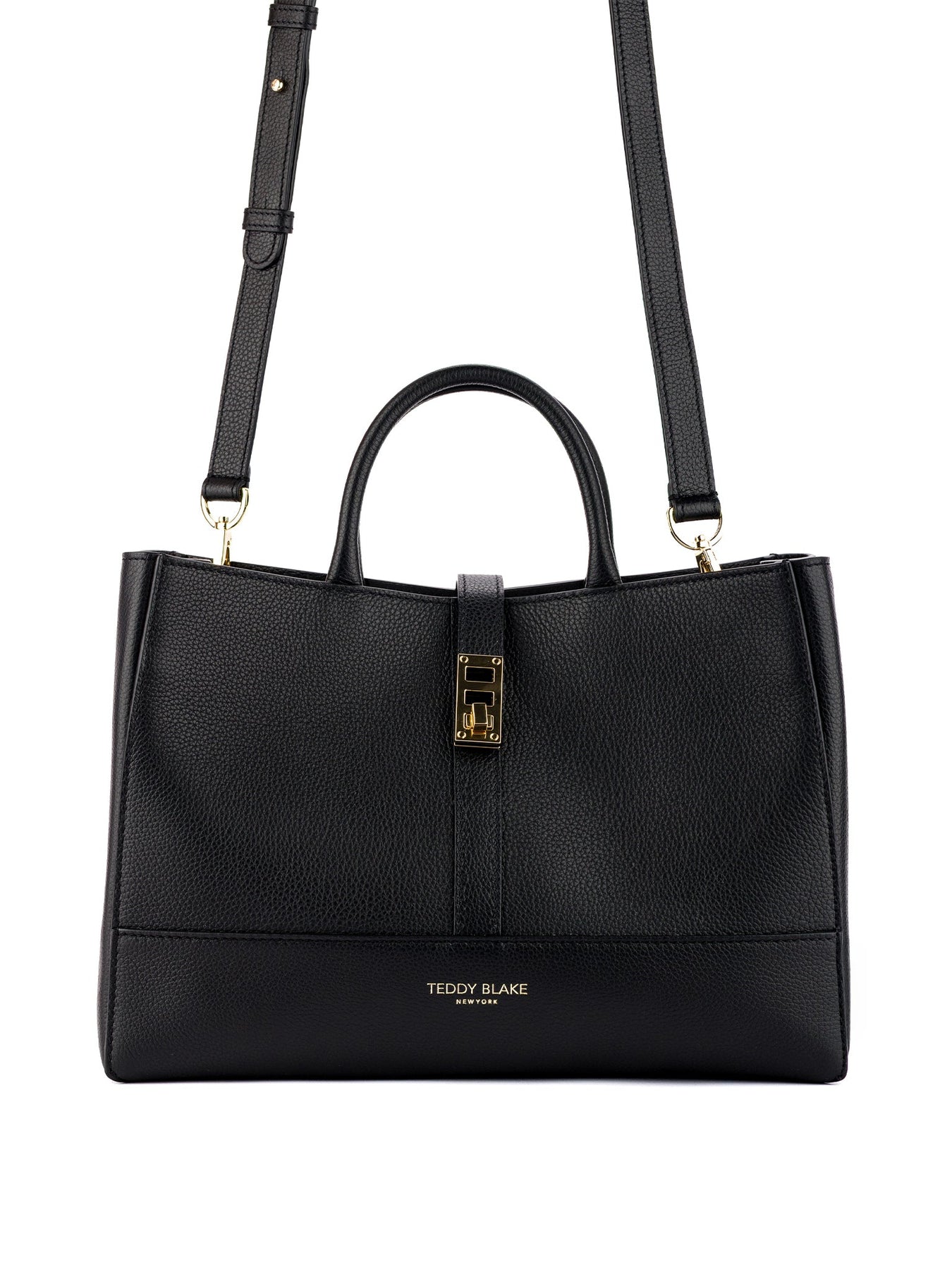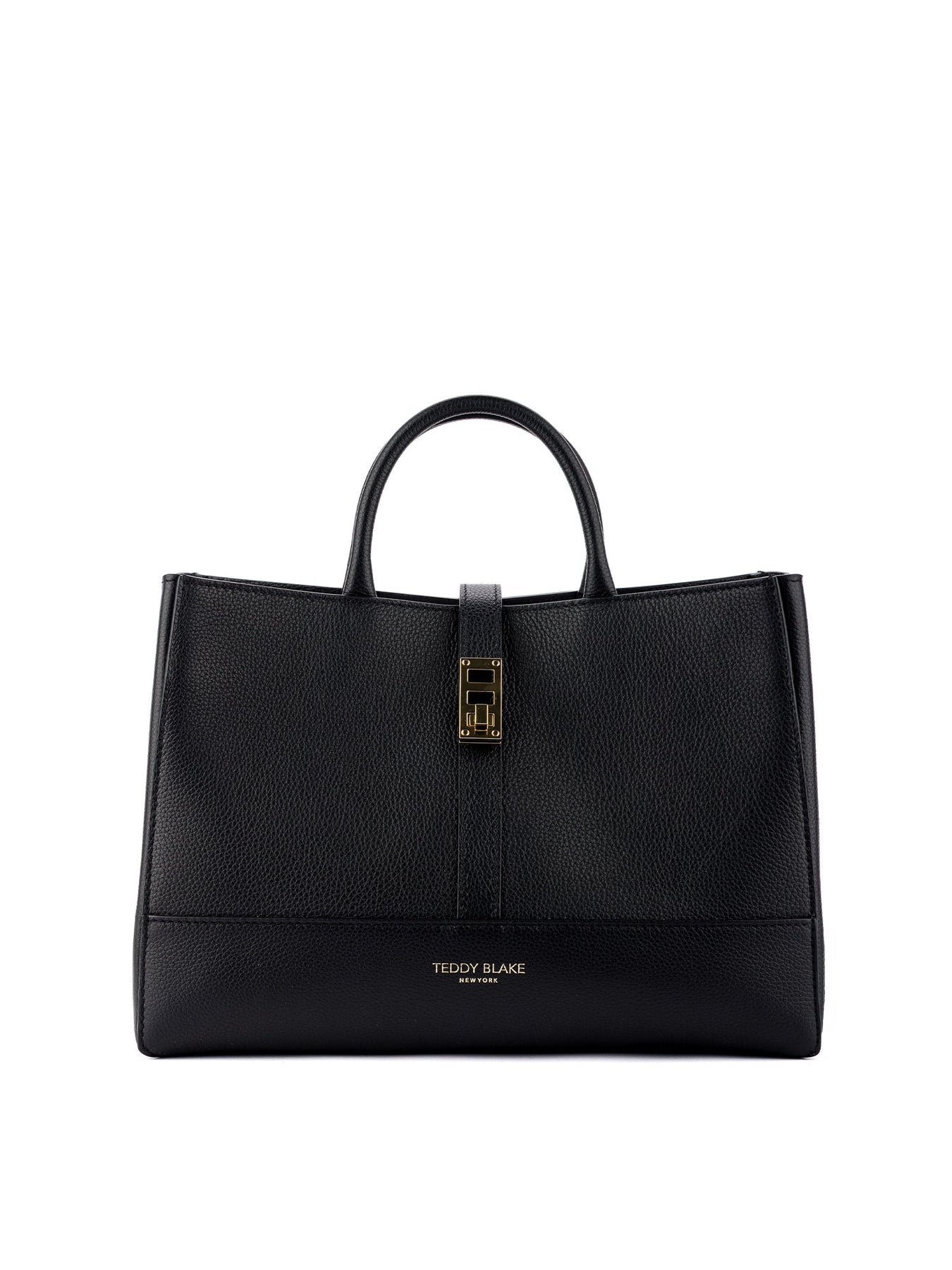 Fashion & function describes the Lola bag, the latest addition to Teddy Blake's line. Crafted in Italy from soft pebbled leather, the boxy silhouette offers versatility with double top handle, shoulder strap, and a spacious, suede-lined interior. Adorned with gold detailing the center strap closure ads a dash or retro chic to its modern appeal. Style the Lola your way, every day from the office into the city.